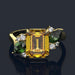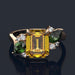 This exquisite gemstone engagement ring showcases a vibrant emerald-cut yellow lab-grown diamond at its center, offering a unique take on timeless elegance. Flanked by deep green pear-cut tourmalines and shimmering round lab-grown diamonds, the arrangement evokes the organic harmony of nature with a refined silhouette. The golden setting enhances the warmth and radiance of the colored stones, creating a ring that feels both enchanting and effortlessly graceful. Designed for those who appreciate color, craftsmanship, and character, this piece is a stunning symbol of individuality and love.