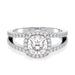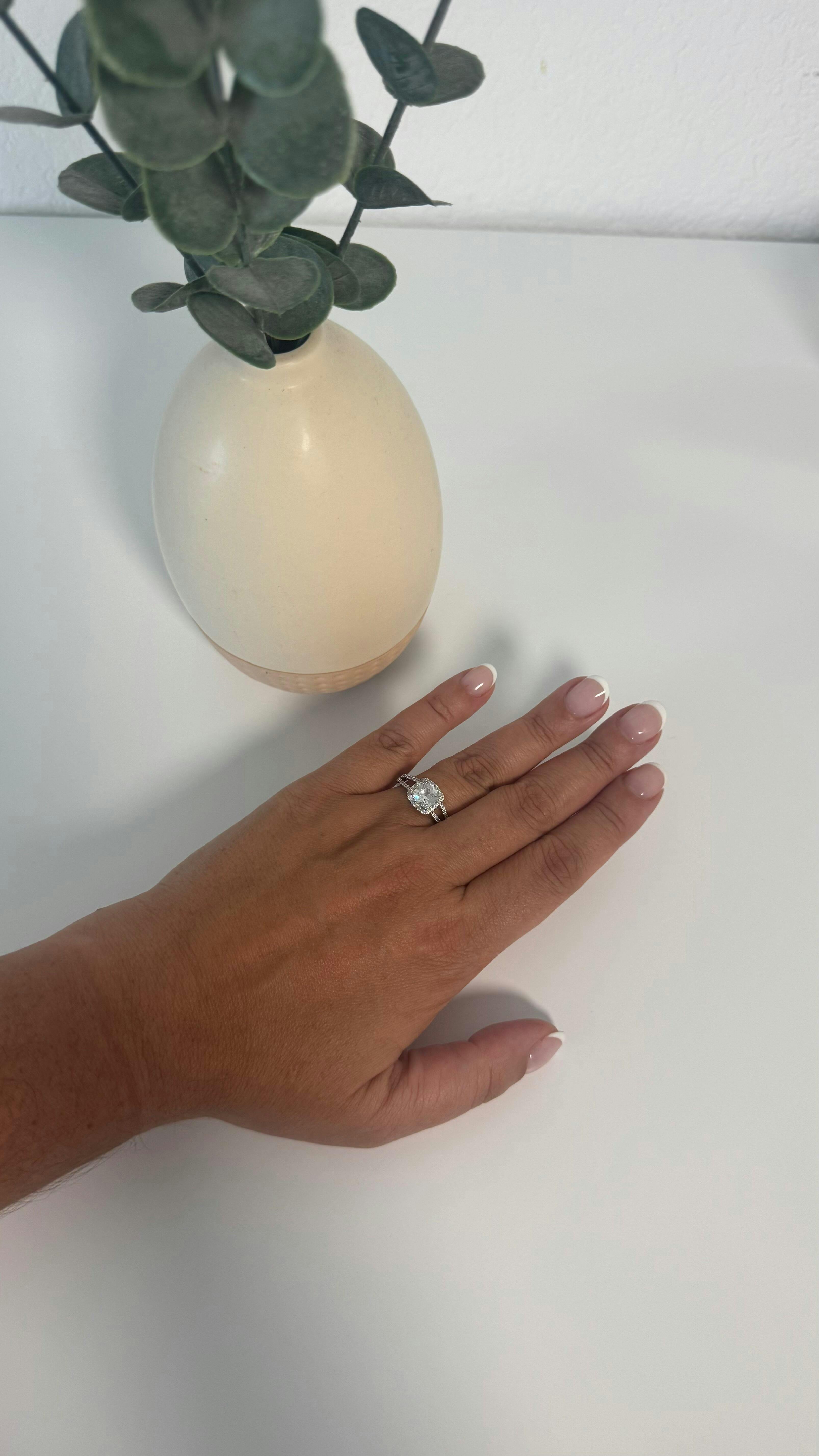 Celebrate everlasting love with this bold and radiant lab-grown diamond engagement ring. A dazzling 2 carat cushion-cut center stone is cradled within a cushion-shaped halo, enhancing its brilliance and giving the piece a luxurious profile. The band features a striking split shank design, pavé-set with diamonds that maximize sparkle from every angle. This statement ring perfectly balances modern elegance with timeless glamour — ideal for the one who loves to shine, ethically and beautifully.