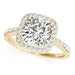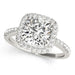 This dazzling engagement ring showcases a brilliant cushion-cut lab-grown diamond nestled within a classic pavé halo, radiating timeless beauty. A cathedral-style shank set with lab-grown diamonds enhances the elegance, while the intricate lattice gallery adds a touch of vintage charm. With a center stone approximately 2.5 carats in appearance, this ring delivers remarkable presence and sophistication.
